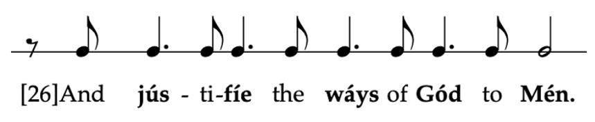 John Milton’s (1608-1674) Paradise Lost is regarded by many as one of the greatest works in the English language. Published in 1667, Milton’s work is an epic poem in blank verse (blank verse is poetry with a regular meter but unrhymed lines) in 10,565 lines divided into ten books (ten in the first edition, redivided into twelve in the second and all subsequent editions). It’s in iambic pentameter. You’ll remember from the previous chapter that iambic pentameter is a meter where iambs, a weak event followed by a strong one (or long followed by short), are arranged in sets of fives, making a unit of ten “beats” (remember that poetic “beats” are different from musical “beats,” which is very annoying to musicians since sometimes one poetic beat has three musical beats and sometimes it has one as in the example below and I would prefer to call the poetic beats “events” but several thousand years of convention can’t be easily, or wisely, over ridden). In the following example I’ve added the ta DUM lyrics traditional to schoolbooks. [Ex.IX.17]