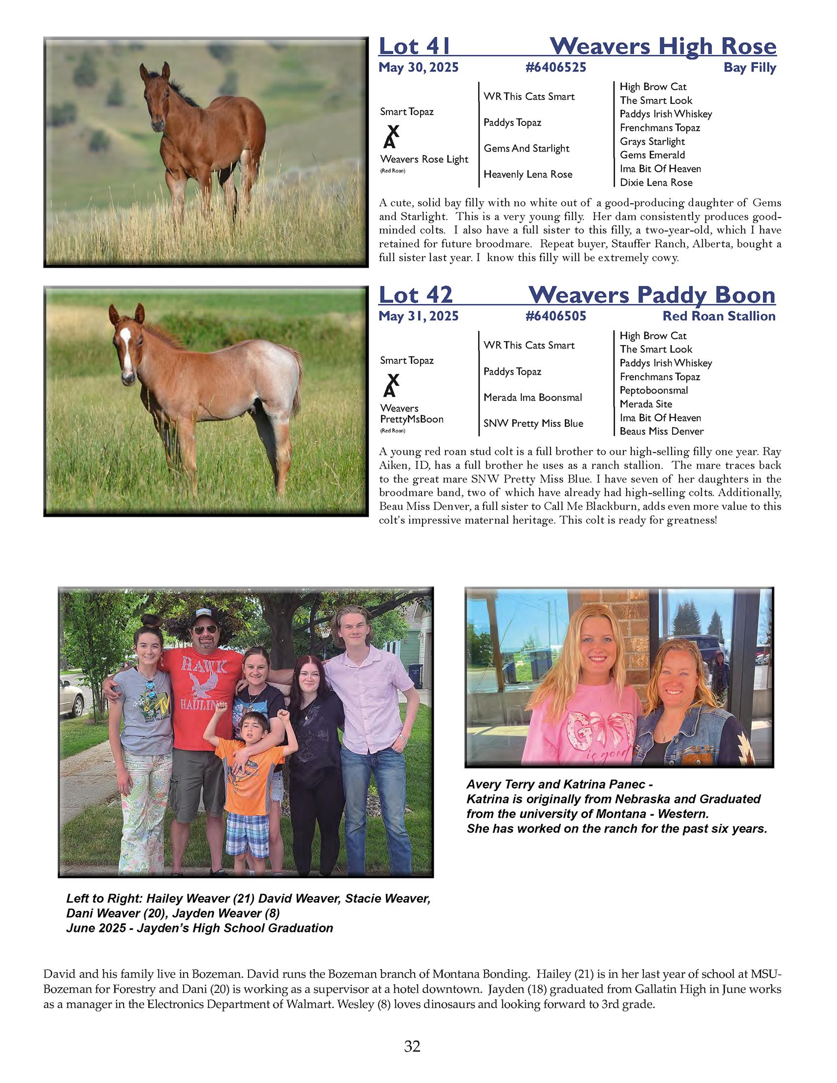 It is with great pride that we welcome you to our 30th annual production sale. We are very excited and proud of the horses we are offering for sale. The Weaver family has a long tradition of raising horses. The family came to Montana in 1888 and have been breeding and raising horses for over 130 years. Our brand, , was recorded in the Weaver name in 1888 and our grandchildren are the sixth generation to ride horses with this brand.