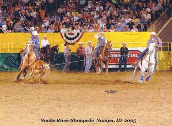 In 2005 Dinero put his athletic ability on display at the Snake River Stampede in Nampa, Idaho. He was shown in barrels by Sherry, heeling by Walt Woodard and heeling by Cory Petska. They combined to win $11,000 at this one rodeo on this great performance stallion.
