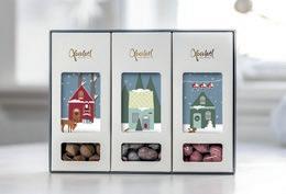 CHRISTMAS CITY HAZELNUT Ca. 90 gr. pebernød med hasselnød. CHRISTMAS CITY LIQUORICE Ca. 90 gr. lakrids med hvid chokolade og hindbær. CHRISTMAS CITY ALMOND Ca. 90 gr. mandler med karamelchokolade. CHRISTMAS CITY GIFT Ca. 270 gr. alle 3 overstående æsker i gavepakken.