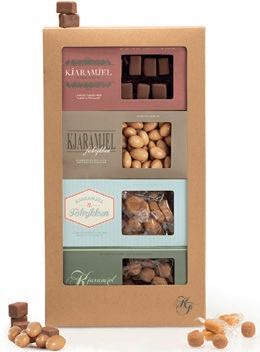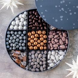Lakrids med mælkecokolade, mandler med solbær og karamelmandler. Leveres i smuk grå æske, klar til at give som gave. Ca. 270 gr.