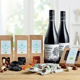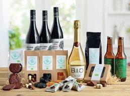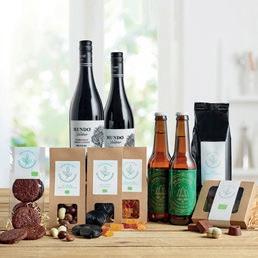 3 fl. Mundo de Yuntero, Organic Tempranillo, Merlot & Syrah, Spanien; 2 fl. Økologisk IPA 2x33 cl.; 1 fl. Mundo de Yuntero, Bio Sparkling, Spanien; Økologisk Arabica kaffe 175 g.; Økologiske småkager m/kakao & Quinoa 80 g.; 10 stk. Økologisk Luksuschokolade 95 g.; Økologisk vingummi 90 g.; Økologisk lakrids 90 g.; Blandede nødder & mandler m/chokoladre 90 g.; 6 stk. Økologiske Trøfler; God Jul - Økologisk Gløgg (alkoholfri); Økologisk Gløggmix 90 g.; Pakket i kartonæske m/træuld