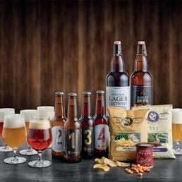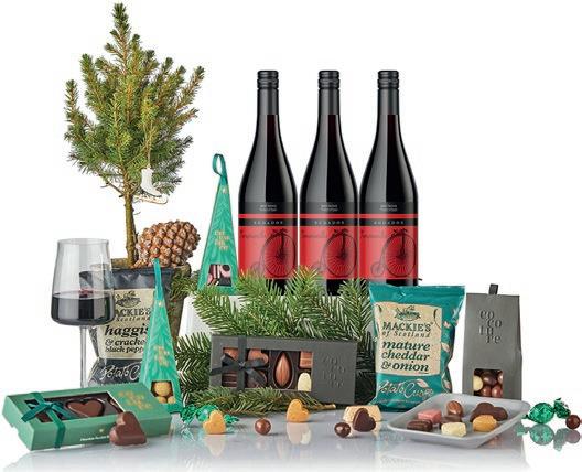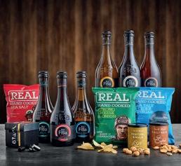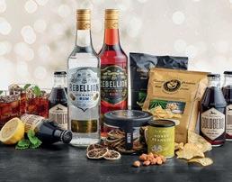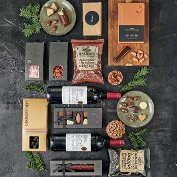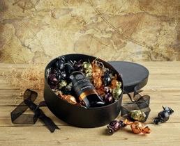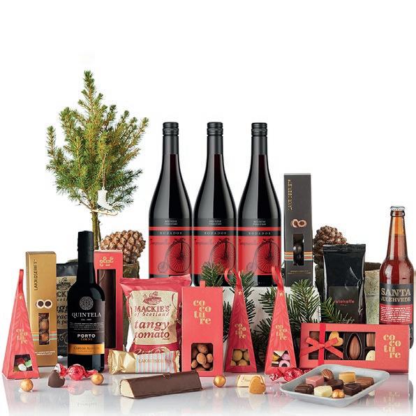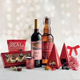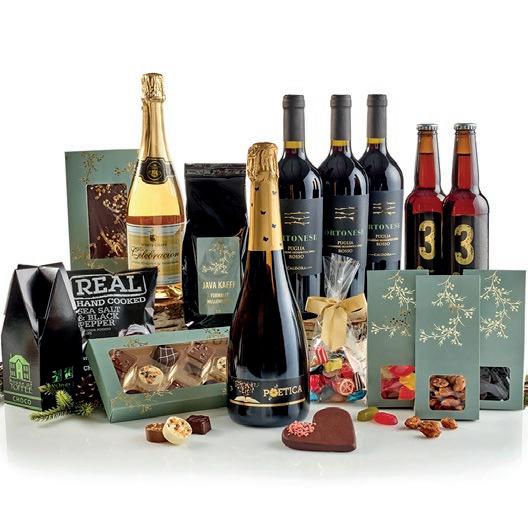3 fl. Ortonese, Puglia Rosso, Italien; 2 fl. Brewsmith 2x33 cl.; 1 fl. Poetica Sparkling, Spanien; 1 fl. Celebracion - White Grape 75 cl.; 10 stk. Dansk Luksuschokolade 100 g.; REAL Chips 35 g.; Vingummi 90 g.; Lakridsblanding 90 g.; Brændte mandler 90 g.; Chokoladeplade 80 g.; Blåvand Bolcher - Mix 100 g.; Java kaffe 175 g.; House of Toffee - Karameller 100 g.; Marcipanhjerte 45 g. Pakket i kartonæske m/træuld
