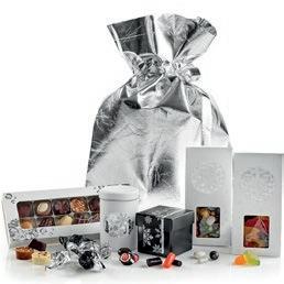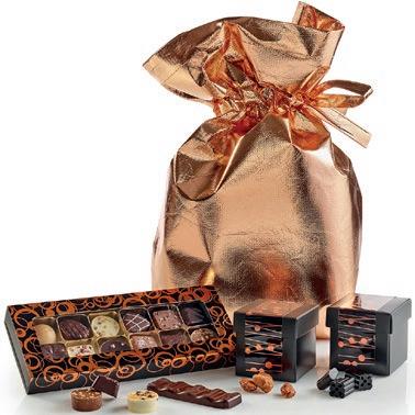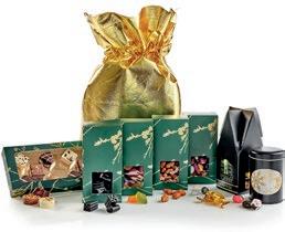 12 stk. Luksuschokolade 120 g.; Brændte mandler 90 g.; Lakridsblanding 90 g.; Chokoladestang 25 g.; Pakket i bronze stofpose