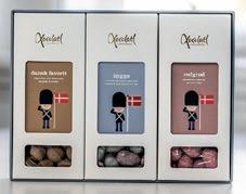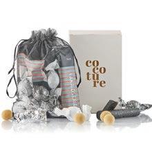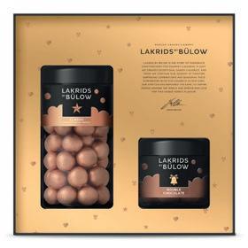 Et skønt mix af Cocoture fyldte chokoladekugler, i fløde chokolade med kokos indpakket i hvid folie, mørk chokolade med cheesecake og amarettocreme indpakket i stålgrå folie og mørk chokolade med crispkerne indpakket i sølvfolie, herudover 2 stk. rene lakridsstænger og 2 stk. lakridsstænger med flødechokolade fra Lakridseriet. Leveret i sort giftbag i hvid Cocoture box. 450g.