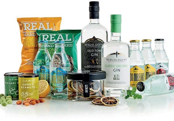 1 fl. Bergslagens Organic Gin 50 cl.; 1 fl. Bergslagens Old Tom Gin 50 cl.; 2 fl. Goldberg Classic Tonic 2x20 cl.; 2 fl. Goldberg Mediterranean Tonic 2x20 cl.; 2 fl. Goldberg Yuzu Tonix 2x20 cl.; 2 ps. REAL Chips 2x35 g.; Snack Attack - Wasabinuts 35 g.; Snack Attack - Honning Peanuts 50 g.; Bartender Garnish - Tørret citronskiver 40 g.; Pakket i kartonæske m/træuld