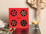 Mix af Cocoture fyldte chokoladekugler i solgul (flødechokolade med karamel), lysegrøn (flødechokolade med lakrids) og bordeaux (lyserød chokolade med lakrids/hindbær).