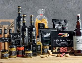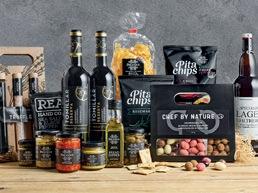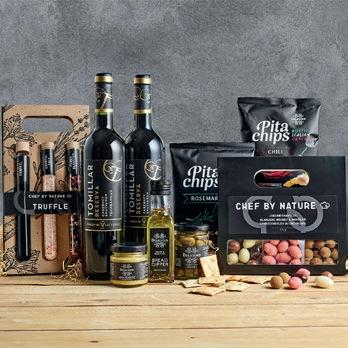 3 fl. Tomillar, Cabernet Sauvignon-Tempranillo Reserva, Spanien; Dipmix Gaveæske m/3 stk.Glasrør (Harissa 28 g., Café De Paris 42 g. & Hvidløg 21 g.); Grønne oliven 140 g.; 2 ps. Brødchips - Rosmarin og Chili 2x80 g.; Sennep 90 g.; Chokoladetaske (Lakridskugler m/chokolade, Jordbærmandler & Blandede nødder & mandler m/chokolade) 270 g.; Breaddipper 125 ml.; Tagliatelle Pasta 250 g.; Basilikum Pesto 90 g.; Tapenade - Tomat 130 g.; Tapenade - Oliven 130 g.; Lager Specialøl 100 cl.; REAL Chips 35 g.; Balsamico Di Modena 125 ml.; Pakket i kartonæske m/træuld