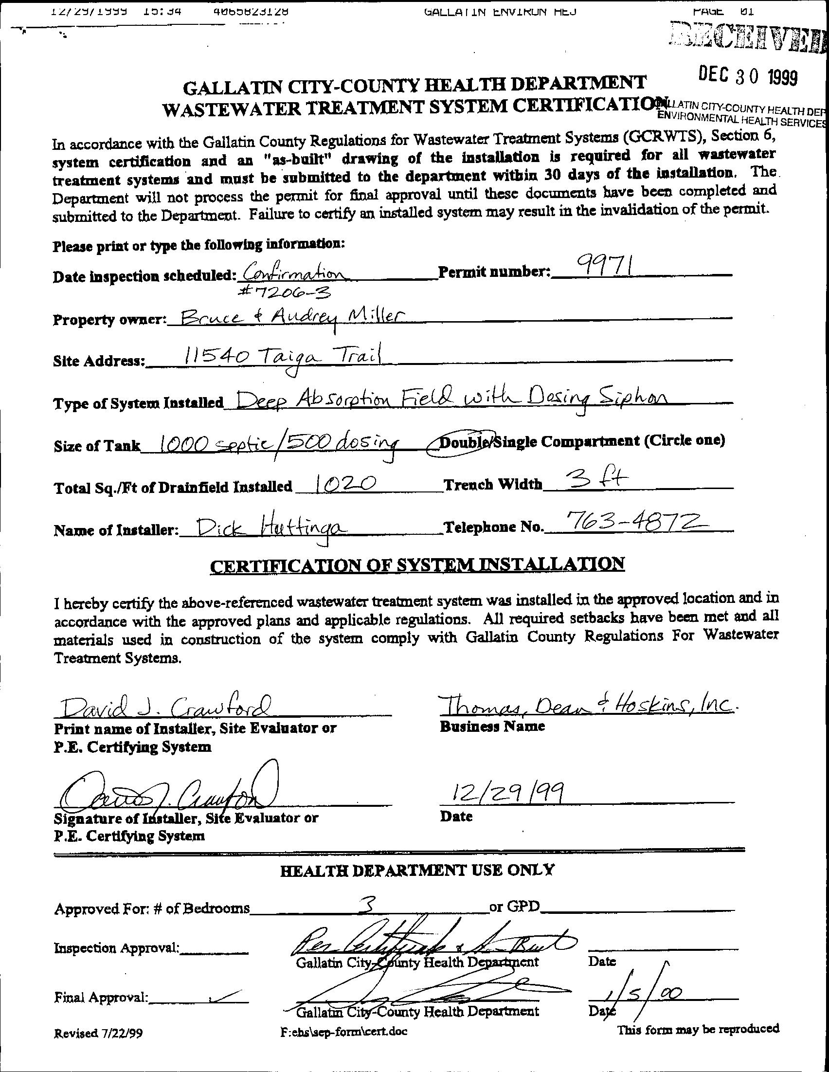 All work performed and reported in this well log is in compliance with the Montana well construction standards. This report is true to the best of my knowledge.