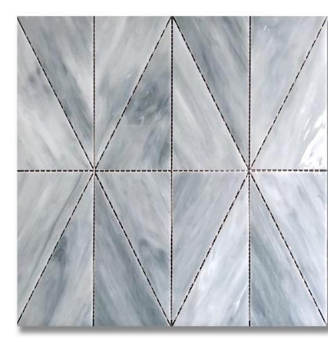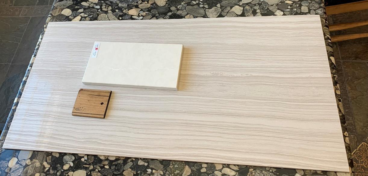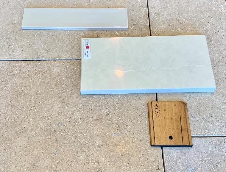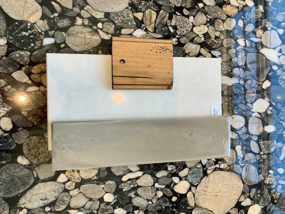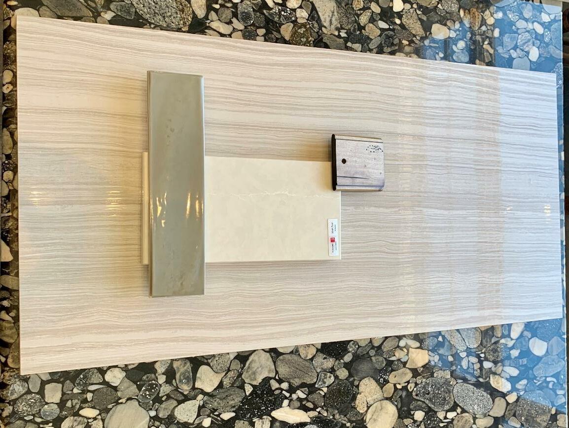 Shower Walls: 12”x24” White Haze Marble Honed Shower Pan: 2”x2” White Haze Marble Vanity Wall Accent Tile: 5”x10” Urbano Modern Floor: 7”x59” Woodland Medium Porcelain Plank