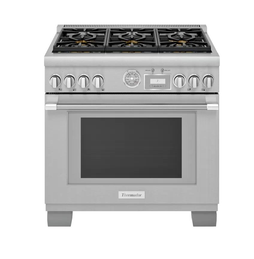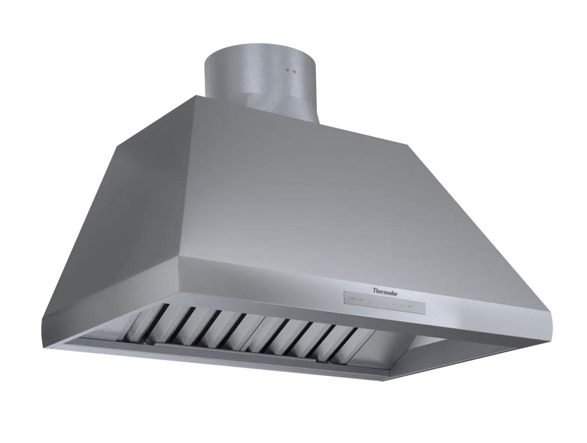 Kitchen Six Star® Burners: Our patented five-point design provides equal flame distribution for even cooking. 4 ExtraLow® Burners: These burners offer precise settings that are perfect for simmering meals or melting chocolate without burning. True Convection Oven: Convection oven with a third element, adds greater efficiency to your convection baking to cook up to five levels of sheet pans evenly. Dual Fuel Professional Range 36” Pro Grand® Commercial Depth Stainless Steel Kitchen Crafted to complete the ultimate cooking system with Thermador ranges Powerfully Quiet® system accepts integral, inline, and remote blowers Features automatic mode, delay shut-off, and check filter light Beautiful illumination with multi-level, vivid LED lights Dishwasher safe stainless steel baffle filters Pyramid Chimney Wall Hood 36” Stainless Steel