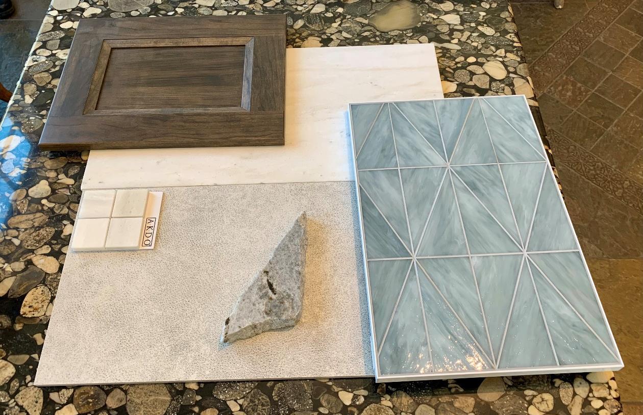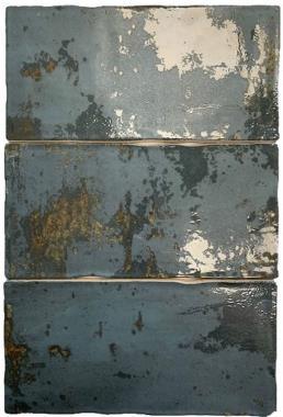 Powder Vanity Accent Wall Kitchen Backsplash: 3”x12” Immersion Awash Voyage Blue (Metallic) Backsplash: 3”x6” Earth Fawn Semi Matte Crackle Upstairs Bonus Bath Shower Walls: 18”x36” Matrix Lappato in Classic Tan Bathroom Floor: 12”x24” Matrix Lappato in Classic Tan