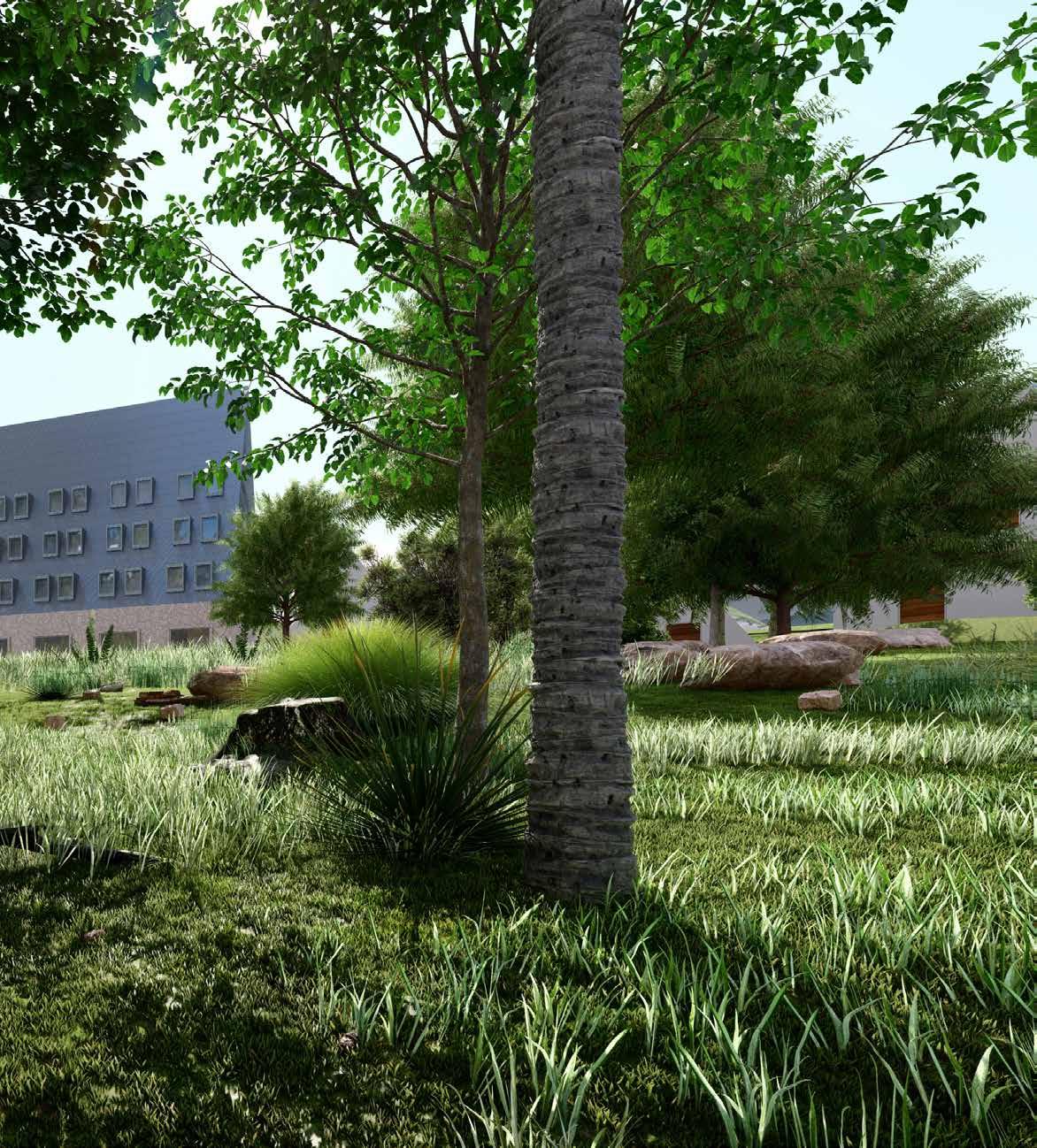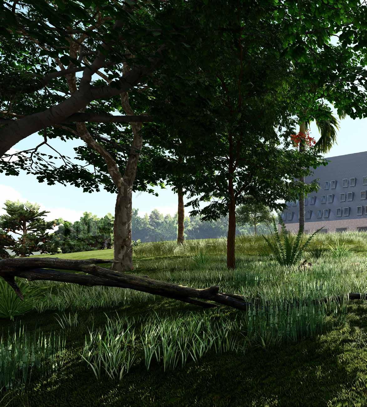 Perspective from couch view: showing relationship between the site and the building