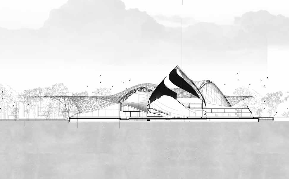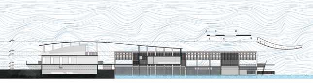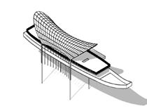 The shielding structure is formed to give the building a feeling of lightness and floating.