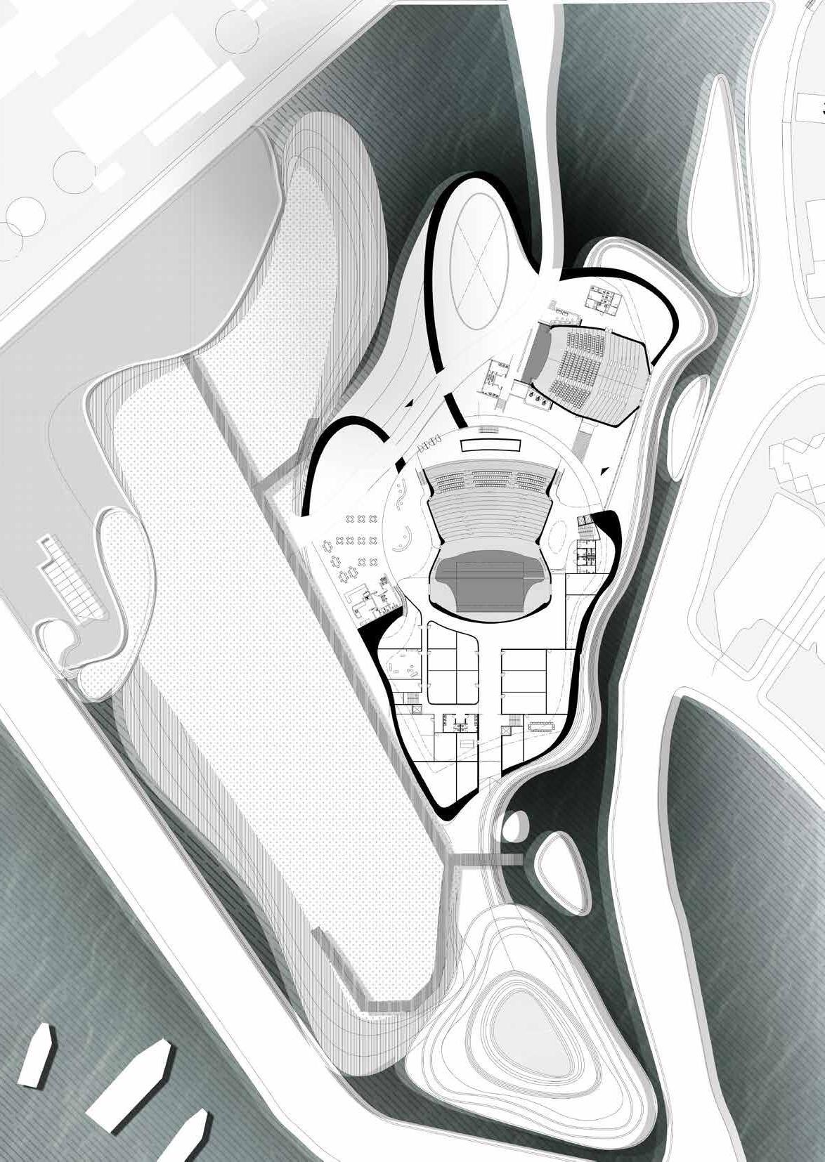 Due to the surrounding complex urban elements, it is necessary to resolve and the long axis separates the vertical connection. There needs to be a separation of divisions to solve each urban problem.