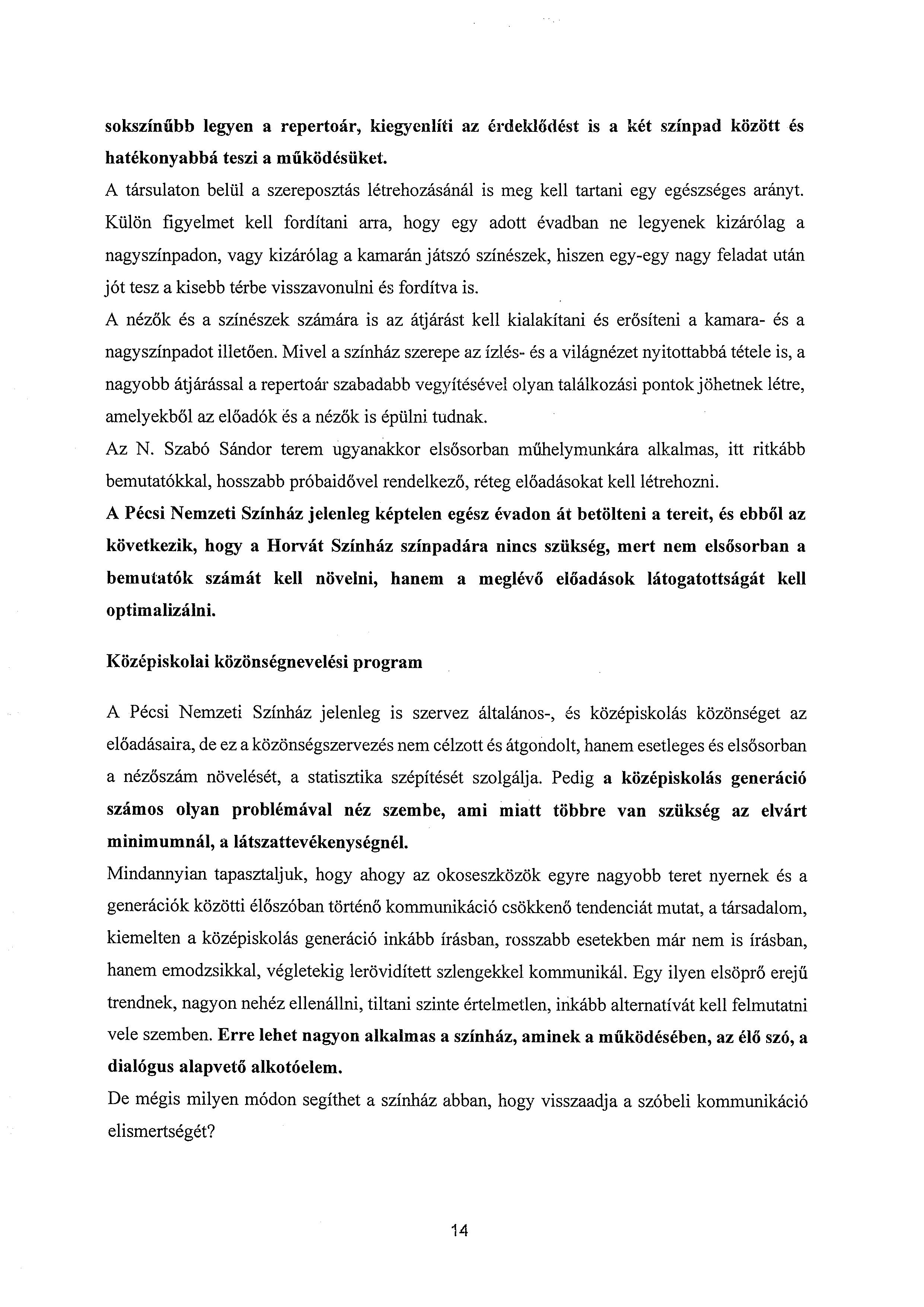 APécsi NemzetiSzínház nemzenésszínház,BalikóTamástávozásaótaarepertoárbantetten érhetőműfajimegoszlásmégisegyértelműenazenés,szórakoztatóműfajokirányábamozdult el, azaz a korábbi évtizedekben a prózai művek presztízse sokkal erőteljesebb volt, mint jelenleg. Ezt a folyamatot – véleményem szerint – az a téves nézőpont alakította ki, hogy a pécsi nézők túlnyomórészt csak vígjátékokra, illetve zenés előadásokra hajlandóak jegyet venni.