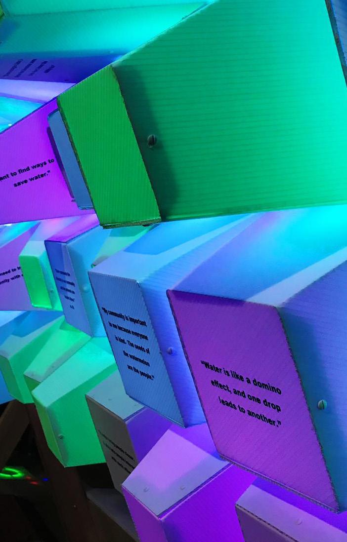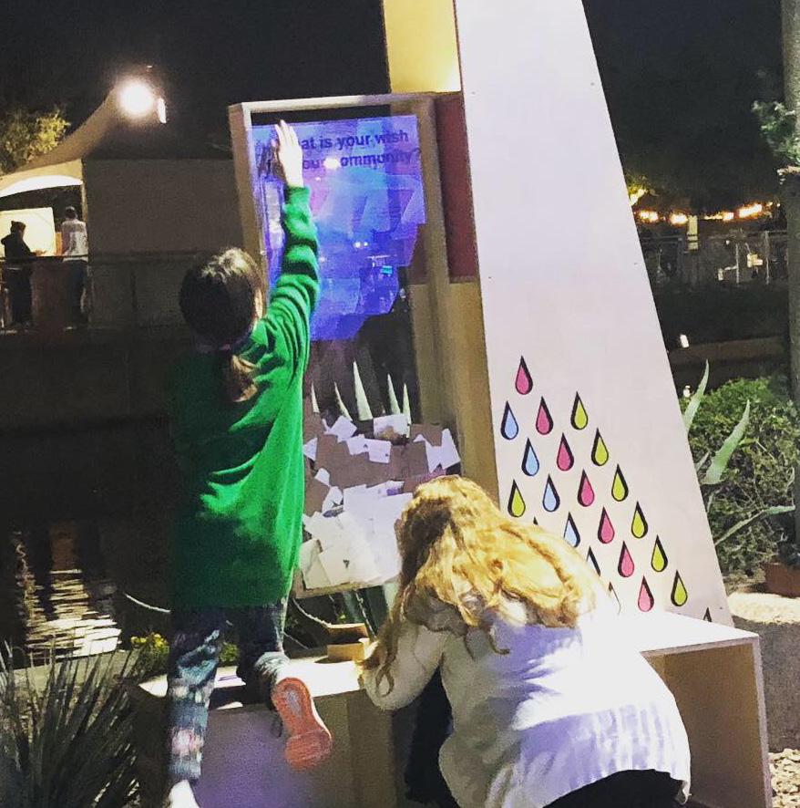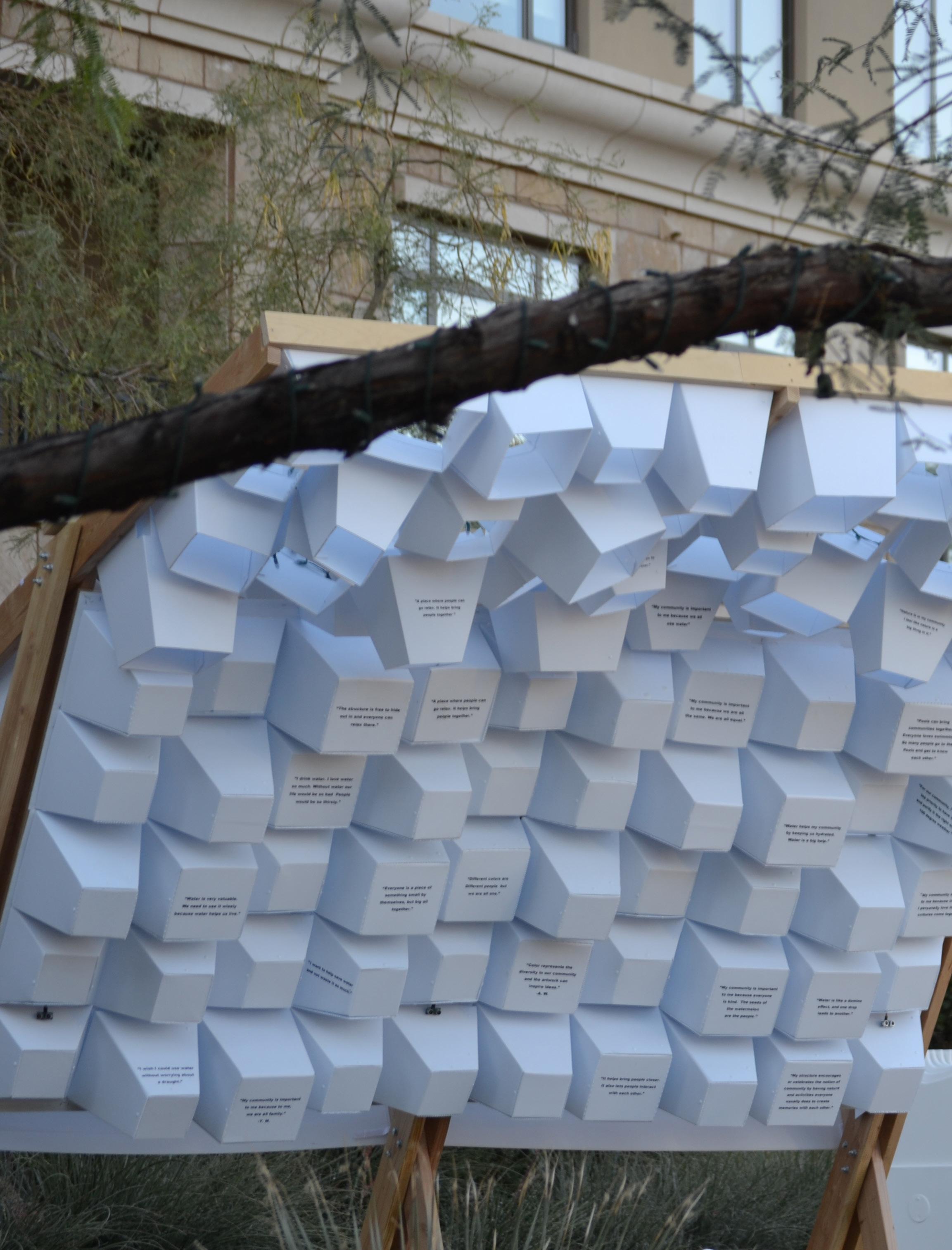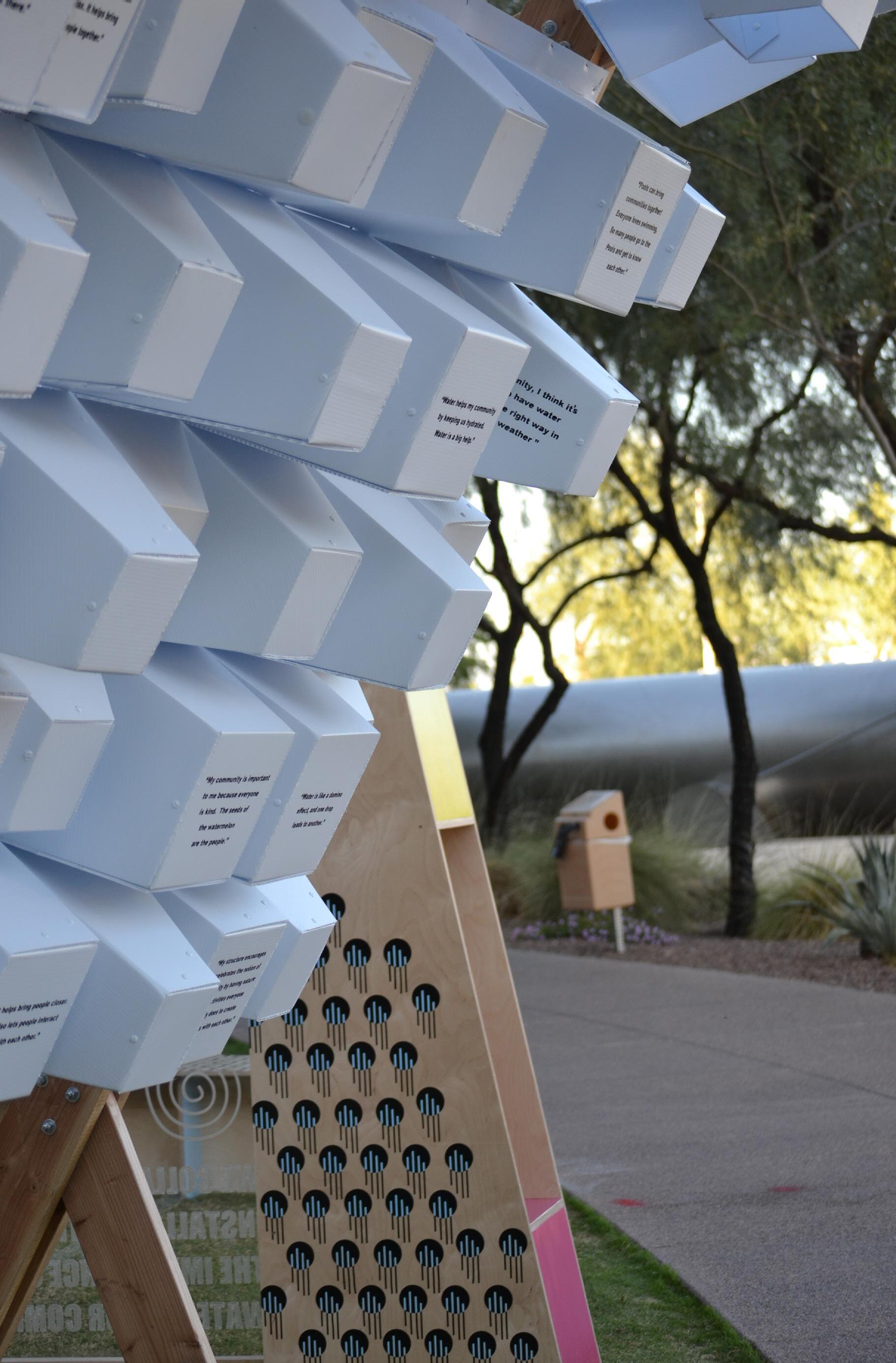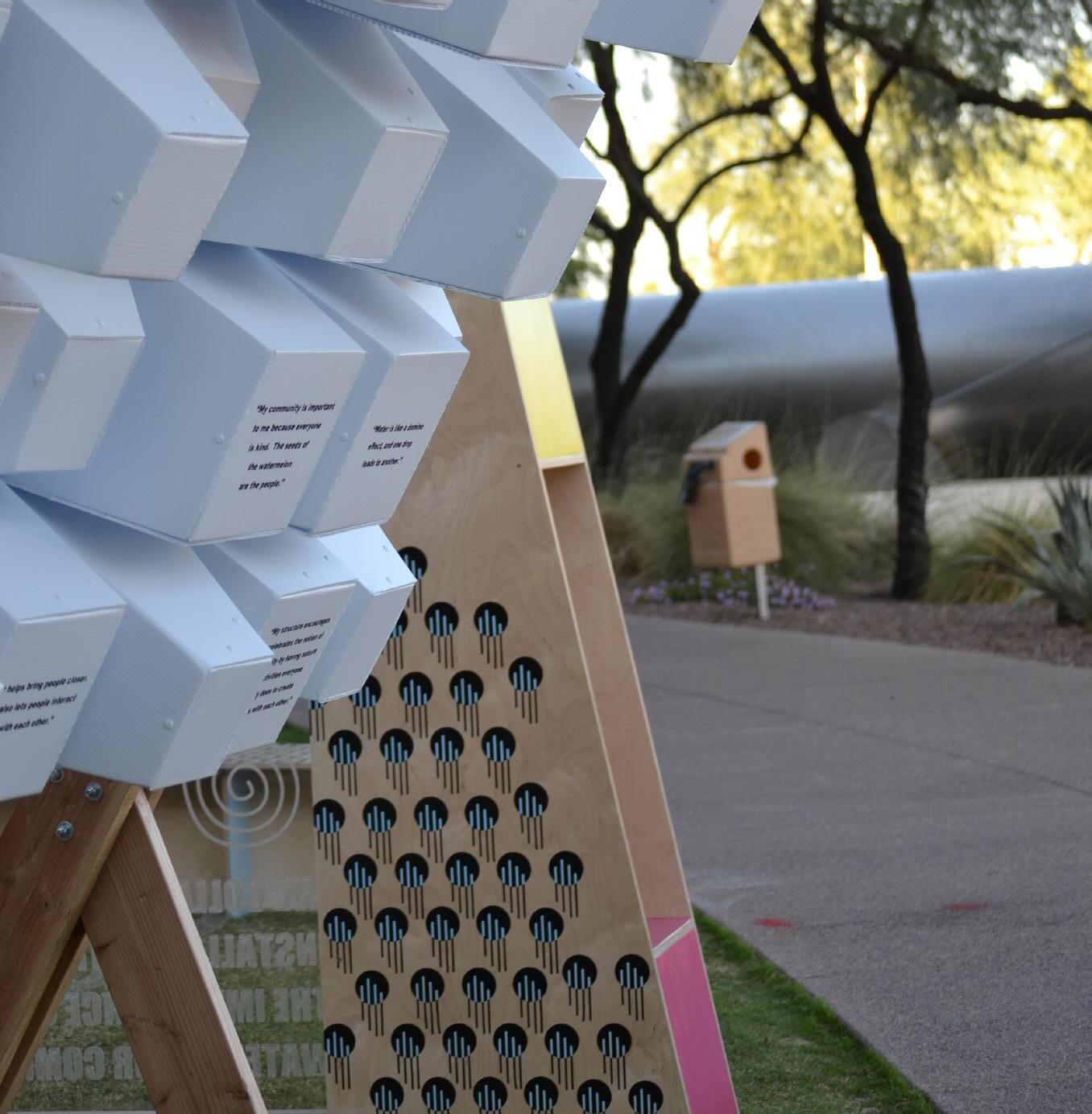 Cumulus seeks to define the relationship between water and community in the context of the Sonoran desert. Interdisciplinary collaboration with ASU’s undergraduate industrial design students allowed the installation to become not only a spatial experience but also a series of micro-interactions at an up-front, personal scale. To further explore the community’s perception of Arizona’s limited resource, we also initiated a participatory collaboration with Tonalea K-8 to design an installation directly reflecting the voice of Scottsdale’s youth. Working with Tonalea resulted in a playful, interactive installation inspired by the students’ excitement and anticipation of water in the desert.
