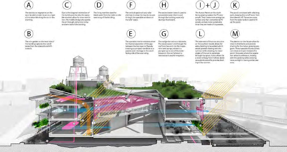 • A Speculative project which aims to create more resilient and equitable cities through innovative and sustainable design solutions. Aims to utilize technologies such as hydroponics and vertical farming to maximize space and minimize resource consumption.
