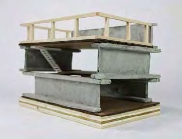 Domino model of stacked I beams providing structural support for the slabs. Stairs and Circulation rest on the exaggerated I beams providing a platform for the stairs.