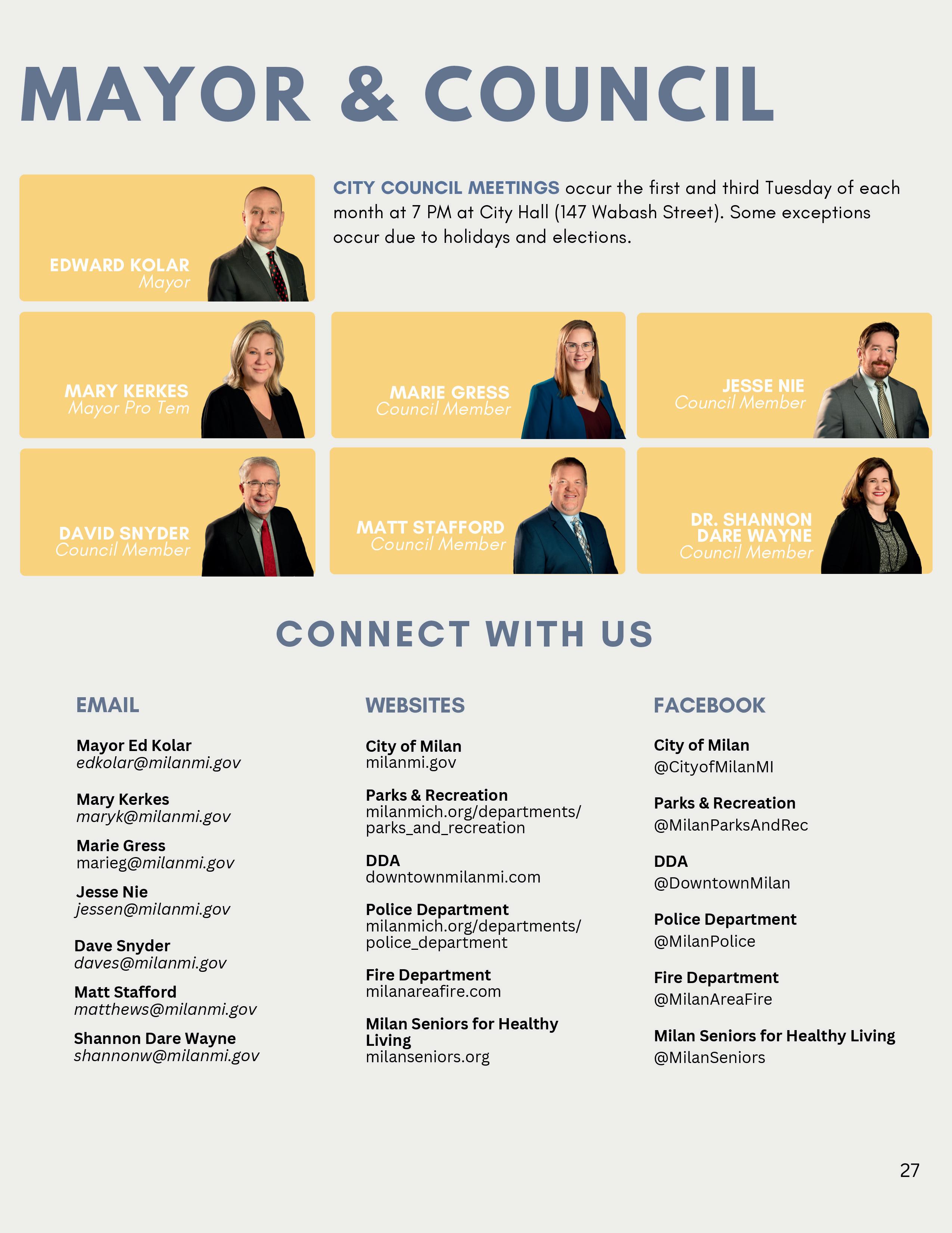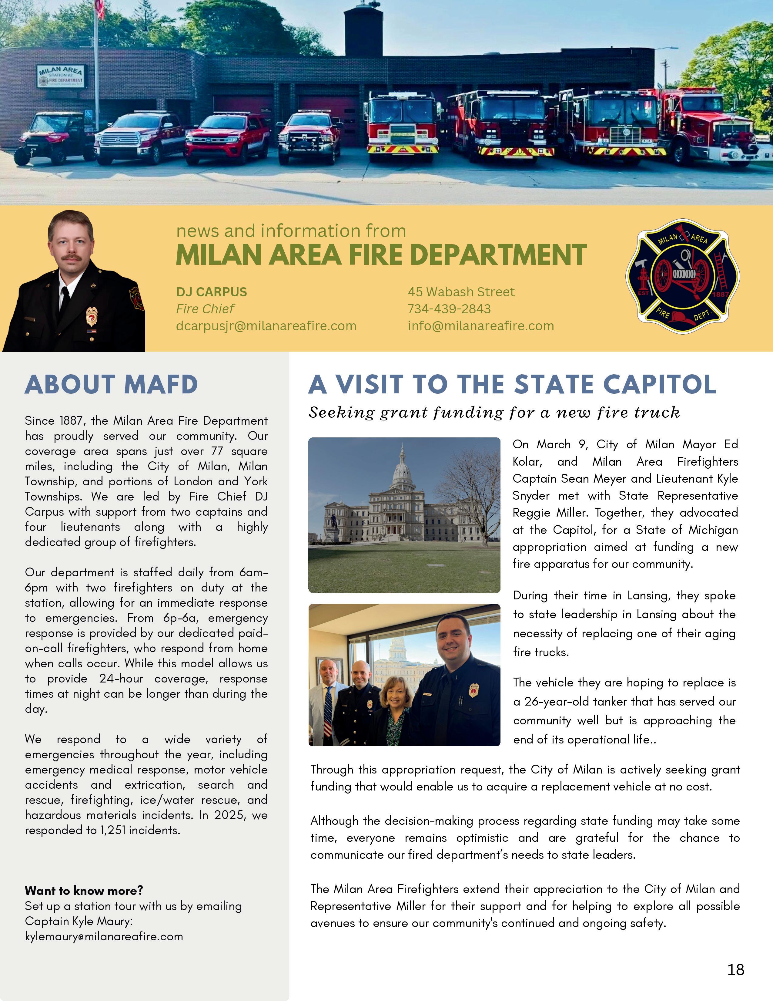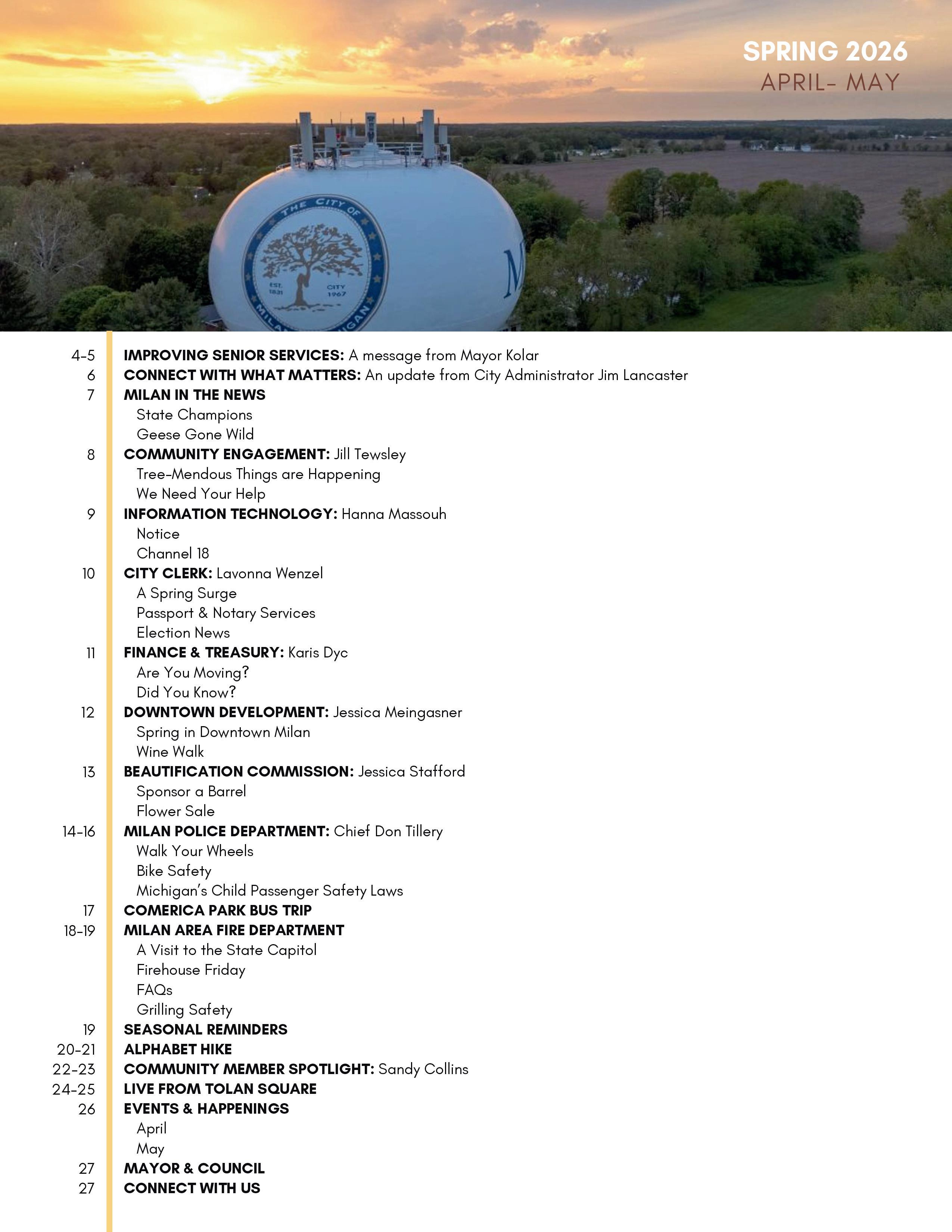 The Connection is the City of Milan’s quarterly news and information resource, delivering local events, city services updates, parks & recreation programs, public meeting schedules, construction and roadwork notices, utility and snow/ice season tips, budget highlights, and community development news. Ideal for residents, business owners, and visitors wanting practical seasonal guidance, volunteer and program opportunities, and ways to engage with city officials and services.