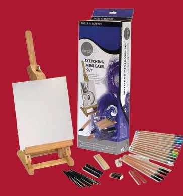 Incluye: lápices de colores + lápices + bloc + 12 barritas de carboncillo + 2 barras de pastel + 2 difuminos + sacapuntas + goma de borrar + hojas de lija + caballete de sobremesa