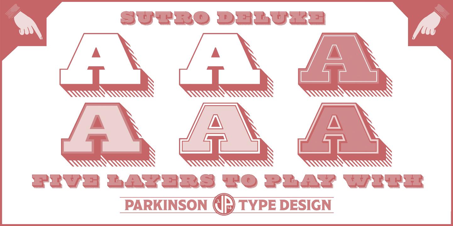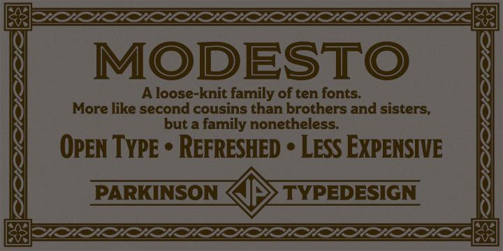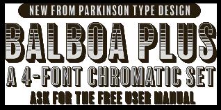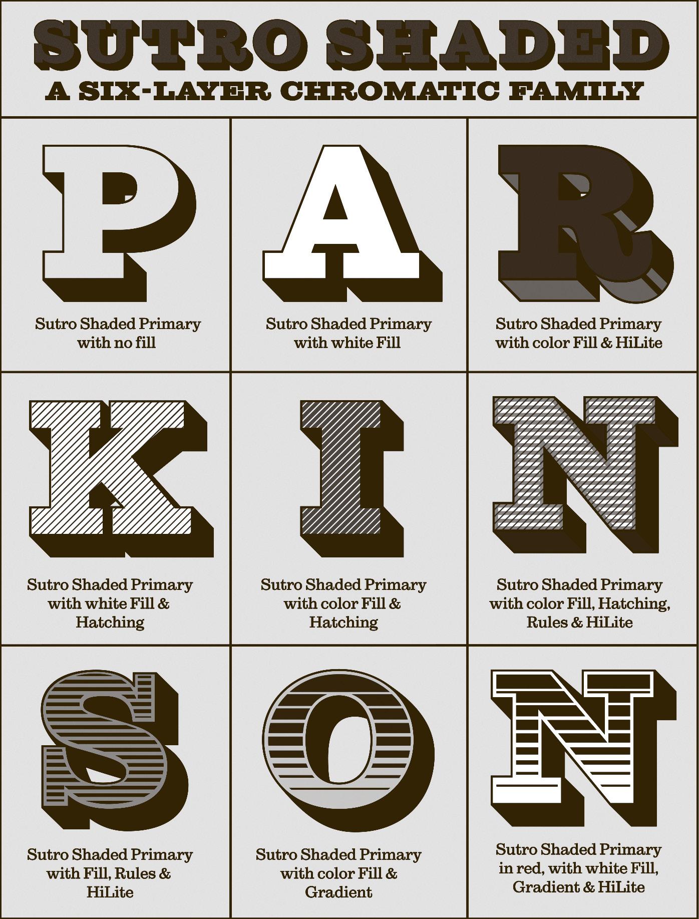 1/ Un extenso panorama de más de cuaren ta tipografías diseñadas por Jim Parkinson. Los nombres están escritos en cada una de las tipografías presentadas. Entre ellas se encuentra Azuza, Parkinson Condensed, Richmond Italic, Generica, Fresno, Matinee, ITC Roswell, Jimbo, Diablo, Hotel, Modesto Lite, Industrial Gothic y Montara, entre otras.