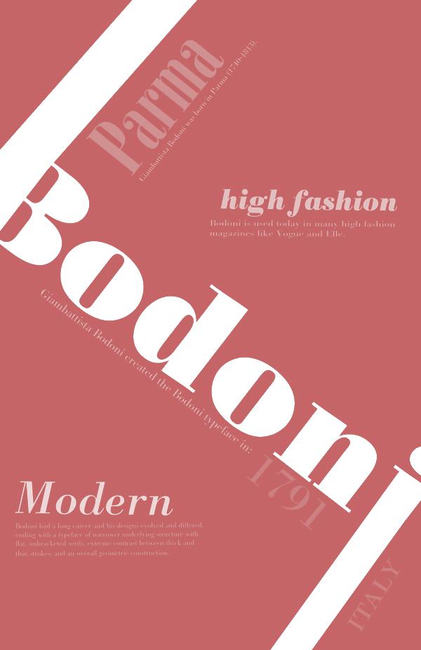 De hecho, Bodoni pasó su vida entera creando una gran colección de más de 400 fuentes. Comenzó con los tipos de Fournier como modelo y con el tiempo desarrolla un estilo personal que tendía a la simplicidad, austeridad, y a un generoso contraste entre finos y gruesos dando como resultado a lo que hoy conocemos como una romana moderna.