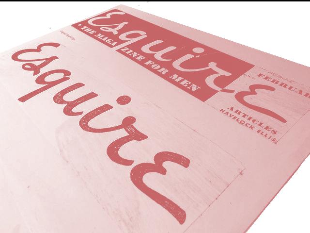 Algunos logotipos son como algunas perso nas. Al envejecer, tienden a aumentar de peso. El logotipo de la revista Esquire siempre ha tenido una forma semi cursiva. La marca original, de 1940, presentaba una cursiva delicada y ligera. En la década de 1960 el logotipo había ganado mucho peso y era más cuadrado. En la versión de 1980 había ganado tanto peso que era casi ilegible. Realicé el rediseño con Roger Black y volvimos a las formas cursivas del logoti po original, le agregamos peso y lo ensan chamos hasta que adquirió aproximada mente la misma forma y color que tenía la versión del logotipo de la década de 1960.
