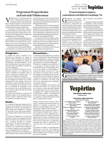 El Vespertino el periódico del pueblo y para el pueblo. Edición Verpertina. Se edita en su propia planta, de AS Ediciones S.A. de C.V. Fundado el 24 de Junio de 1985. INDAUTOR 04-2013080313392900-30, Certificado de Licitud (No. 16053). Servicios informativos de las Agencias Notimex, United Feature Sindicate Inc. N.Y., AP, Laserfoto ABC, Sistema Universal de Noticias (SUN). Conmutador Dirección General: 217-96-46. Gerencia: 217-88-46, 217-84-02. Fax: 217-88-68. Jefatura de Redacción Toluca: 217-98-80. Coordinación en la Ciudad de México. Oficinas y Salas de Redacción: Nayarit No. 88, Col. Roma, México, México, D.F., Tels.: 584-15-81, 584-51-81, 584-06-10. Asociado a AEDIRMEX (Asociación de Editores Diarios de la República Mexicana) y AIPE (Asociación Internacional de Prensa), distribuido por Unión de Expendedores y Voceadores de los Periódicos de México, A.C. Los firmantes son responsables de sus artículos. Precio del Ejemplar $5.00 Números atrasados al doble.Se prohibe la reproducción total o parcial del contenido en está edición. Dirección en Internet: www.miled.com