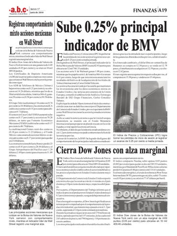 as principales acciones mexicanas que cotizan en la Bolsa de Valores de Nueva York cerraron con comportamiento mixto, mientras el indicador líder de Wall Street registró una marginal alza. El índice Dow Jones de la Bolsa de Valores de Nueva York terminó con una ganancia de 4.69 unidades (0.05 por ciento) y se situó en 10 mil 409.46 puntos. Los Certificados de Depósito Americano (ADR) de las principales empresas mexicanas que cotizan en Wall Street concluyeron la jornada como sigue: Los ADR de Teléfonos de México (Telmex) bajaron tres centavos (0.21 por ciento) y se colocaron en 14.26 dólares, mientras que los de su filial en telefonía celular, América Móvil, ganaron 29 centavos (0.58 por ciento) a 50.58 dólares. El Grupo Televisa disminuyó 14 centavos (0.74 por ciento) a 18.80 dólares y la constructora ICA cedió cinco centavos (0.51 por ciento) para ubicarse en 9.73 dólares. El consorcio Coca-Cola FEMSAaumentó ocho centavos (0.17 por ciento) y se cotizó en 70.28 dólares, en tanto que Fomento Económico Mexicano (FEMSA) subió ocho centavos (0.17 por ciento) a 46.79 dólares. La multinacional Cemex restó dos centavos (0.18 por ciento) a 11.23 dólares y el Fondo México -una canasta de acciones líderes- avanzó cuatro centavos (0.17 por ciento) para quedar en 23.84 dólares. La constructora inmobiliaria Homex perdió 23 centavos (0.81 por ciento) a 28.04 dólares y el Grupo Aeroportuario del Pacífico cayó 1.29 dólares (3.89 por ciento) para situarse en 31.89 dólares.