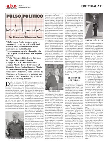 * Reformas a fondo propone ante el congreso el rector de la UNAM, José Narro Robles, en ceremonia por el centenario de la institución * Más recursos para la educación y la UNAM pide Narro Robles al Congreso Federal * Peña Nieto presidió el acto luctuoso de López Mateos en Atizapán * Apoyo a la UNAM ofrecieron el senador Manlio Fabio Beltrones y el diputado Jorge Carlos Ramírez Marín * Controvertidas comparecencias de funcionarios federales, en la Cámara de Diputados y Senadores: se asegura que esconde el PRD al fallido Dip. Federal Julio César Godoy Toscano