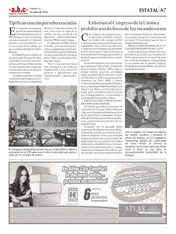 del Consumidor (Profeco), ofrecen ahorros en gasto energético y tienen una vida útil hasta 10 veces mayor que un foco o lámpara incandescente. PRESENTARÁ INFORME DE ACTIVIDADES PRESIDENTE DE LA JCP El diputado Ernesto Nemer Álvarez, presidente de la Junta de Coordinación Política presentará el próximo 21 de octubre su informe de labores correspondiente a su primer año de gestión, según lo aprobado por unanimidad de votos por los legisladores locales.