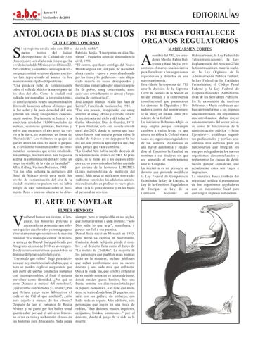 do en la niebla”. Fabrizio Mejía, “Insurgentes en días lluviosos”, Pequeños actos de desobediencia civil, 1996. “El centro, que fuera ombligo del Nuevo Mundo alguna vez, del país, de la ciudad, ahora resulta —poco a poco abandonado por los ricos y los poderosos— una abigarrada mezcla de nacos desesperados y burócratas enmarcados por una escenografía de polvo, smog concentrado, atroz calor seco (reverberante en densas y largas costras de carrocerías)”. José Joaquín Blanco, “Calle San Juan de Letrán”, Función de medianoche, 1981. “Ese aire pesado, irrespirable, ese smog anterior al smog, denso y cerrado, refiere la inexistencia del cielo y del infierno”. Carlos Monsiváis, Días de Guardar, 1971. Y para finalizar, está esta novela situada en el año 2029, donde se supone que hace cinco lustros una materia poluta cubre la ciudad de México y no deja pasar la luz del sol, una profecía apocalíptica que, hay días, parece que va a cumplirse. “La Ciudad Alta había nacido después de la hiperinversión térmica de 2003. Al principio, se le llamó así a los escasos edificios cuyos pisos más altos habían quedado por encima de la horrorosa LIMEMES (Línea metropolitana de medición del smog). Más tarde se edificaron torres elevadísimas con todos los adelantos antisísmicos diseñados ex profeso en cuyos pisos altos vivía la gente decente y en los bajos el personal de servicio.