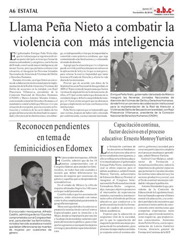 l gobernador Enrique Peña Nieto dijo que la violencia que se registra en diversas partes del país se tiene que frenar de manera contundente y categórica, con la fuerza del Estado; con el uso de mayor inteligencia y de menor fuerza, pero que permita contener esta situación, al inaugurar las Novenas Jornadas Nacionales de Atención de Víctimas del Delito y Derechos Humanos. Durante el evento, en el que firmó un convenio de colaboración institucional para la implementación de la Red de Atención a Víctimas del Delito de secuestro en la entidad, con Raúl Plascencia Villanueva, presidente de la Comisión Nacional de Derechos Humanos (CNDH) y Marco Antonio Morales Gómez, comisionado estatal de Derechos Humanos, el mandatario estatal señaló que México vive una situación de excepción, pues la creciente sofisticación y violencia de las actividades de los grupos delincuenciales ha desafiado la capacidad y eficiencia de las Instituciones; sin embar-