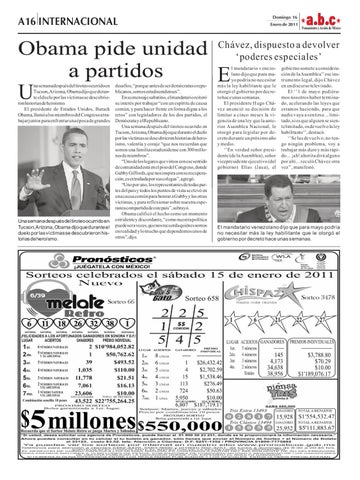 desafíos, “porque antes de ser demócratas o republicanos, somos estadounidenses”. En su mensaje sabatino, el mandatario reiteró su interés por trabajar “con un espíritu de causa común, y para hacer frente en forma digna a los retos” con legisladores de los dos partidos, el Demócrata y el Republicano. Una semana después del tiroteo ocurrido en Tucson,Arizona, Obama dijo que durante el duelo por las víctimas se descubrieron historias de heroísmo, valentía y coraje “que nos recuerdan que somos una familia estadunidense con 300 millones de miembros”. “Uno de los lugares que vimos con ese sentido de comunidad está en el piso del Congreso, donde Gabby Giffords, que nos inspira con su recuperación, es extrañada por sus colegas”, agregó. “Uno por uno, los representantes de todas partes del país y todos los puntos de vista se elevó en una causa común para honrar a Gabby y las otras víctimas, y para reflexionar sobre nuestra esperanza compartida de este país”, subrayó. Obama calificó el hecho como un momento estridente y discordante, “como nuestra política puede ser a veces, que nos recuerda quiénes somos en realidad y lo mucho que dependemos unos de otros”, dijo.