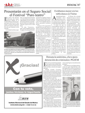 l Teatro del Instituto Mexicano del Seguro Social (IMSS) en el Estado de México Poniente formará parte del Festival “Puro Teatro”, el cual se desarrollará del 25 al 31 de julio, en diversos foros de este instituto a nivel nacional. La entrada a las obras es gra-