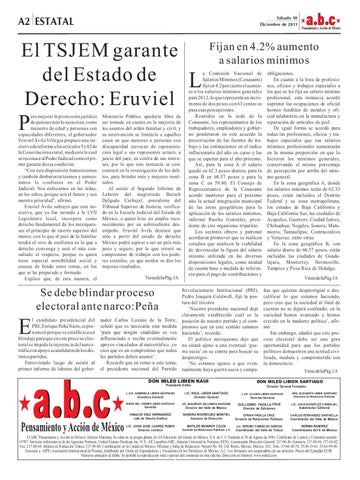 El ABC Pensamiento y Acción de México. Edición Matutina. Se edita en su propia planta, de AS Ediciones del Estado de México, S.A. de C.V. Fundado el 30 de Agosto de 1984. Certificado de Licitud y Contenido número 14787. Servicios informativos de las Agencias Notimex, United Feature Sindicate Inc. N.Y., AP, Laserfoto ABC, Sistema Universal de Noticias (SUN). Conmutador Dirección General: 217-96-46. Gerencia: 217-88-46, 217-84-02. Fax: 217-88-68. Jefatura de Redacción Toluca: 217-98-80. Coordinación en la Ciudad de México. Oficinas y Salas de Redacción: Nayarit No. 88, Col. Roma, México, México, D.F., Tels.: 55-64-40-70, 55-84-15-61, 55-64-99-40. Asociado a AIPE (Asociación Internacional de Prensa), distribuido por Unión de Expendedores y Voceadores de los Periódicos de México, A.C. Los firmantes son responsables de sus artículos. Precio del Ejemplar $5.00. Números atrasados al doble. Se prohibe la reproducción total o parcial del contenido en está edición. Dirección en Internet: www.miled.com