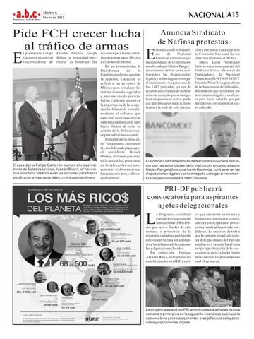 acciones para frenar el tráfico de armas hacia México y el lavado de dinero. En un comunicado, la Presidencia de la República informó que tras la reunión, Calderón se refirió a las acciones de México para fortalecer las instituciones de seguridad y procuración de justicia. Felipe Calderón insistió en la importancia de la cooperación bilateral, complementaria al esfuerzo que cada país realiza dentro de su propia jurisdicción, para hacer frente al reto en común de la delincuencia organizada transnacional. El mandatario mexicano “igualmente, reconoció las medidas adoptadas por el presidente Barack Obama, al tiempo que reiteró la necesidad prioritaria El presidente Felipe Calderón planteó al vicepresi- de fortalecer las acciones dente de Estados Unidos, Joseph Biden, la “necesi- contra el tráfico de armas dad prioritaria” de fortalecer las acciones para frenar hacia nuestro país y el lavael tráfico de armas hacia México y el lavado de dinero. do de dinero”.