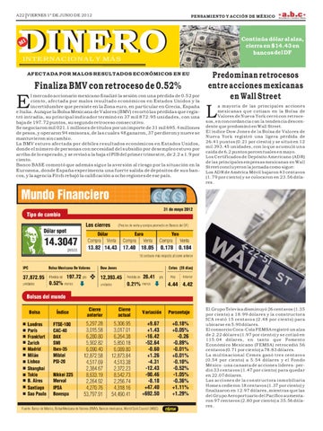 l mercado accionario mexicano finalizó la sesión con una pérdida de 0.52 por ciento, afectada por malos resultado económicos en Estados Unidos y la incertidumbre que persiste en la Zona euro, en particular en Grecia, España e Italia. Aunque la Bolsa Mexicana de Valores (BMV) recortó las pérdidas que registró intradía, su principal indicador terminó en 37 mil 872.95 unidades, con una baja de 197.72 puntos, su segundo retroceso consecutivo. Se negociaron mil 021.1 millones de títulos por un importe de 31 mil 695.4 millones de pesos, y operaron 94 emisoras, de las cuales 48 ganaron, 37 perdieron y nueve se mantuvieron sin cambio. La BMV estuvo afectada por débiles resultados económicos en Estados Unidos, donde el número de personas con necesidad del subsidio por desempleo estuvo por arriba de lo esperado, y se revisó a la baja el PIB del primer trimestre, de 2.2 a 1.9 por ciento. Banco BASE comentó que además sigue la aversión al riesgo por la situación en la Eurozona, donde España experimenta una fuerte salida de depósitos de sus bancos, y la agencia Fitch rebajó la calificación a ocho regiones de ese país.