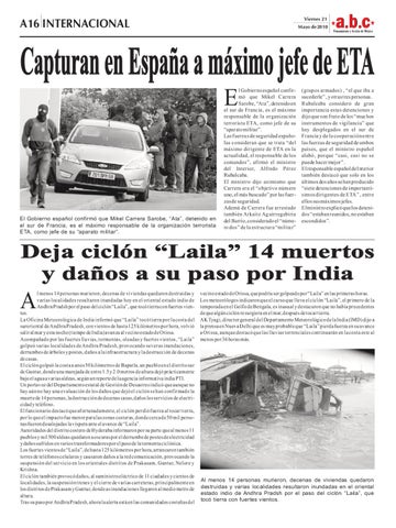 tos. La Oficina Meteorológica de India informó que “Laila” tocó tierra por la costa del suroriental de Andhra Pradesh, con vientos de hasta 125 kilómetros por hora, volvió salir al mar y esta noche (tiempo de India) avanza al vecino estado de Orissa. Acompañado por las fuertes lluvias, tormentas, oleadas y fuertes vientos, “Laila” golpeó varias localidades de Andhra Pradesh, provocando severas inundaciones, derrumbes de árboles y postes, daños a la infraestructura y la destrucción de decenas de casas. El ciclón golpeó la costa a unos 50 kilómetros de Bapatla, un pueblo en el distrito sur de Guntur, donde una marejada de entre 1.5 y 2.0 metros de altura dejó prácticamente bajo el agua a varias aldeas, según un reporte de la agencia informativa india PTI. Un portavoz del Departamento estatal de Gestión de Desastres indicó que aunque no hay aún no hay una evaluación de los daños que dejó el ciclón se han confirmado la muerte de 14 personas, la destrucción de decenas casas, daños los servicios de electricidad y teléfono. El funcionario destacó que afortunadamente, el ciclón perdió fuerza al tocar tierra, por lo que el impacto fue menor para las zonas costeras, donde cerca de 50 mil personas fueron desalojadas la víspera ante el avance de “Laila”. Autoridades del distrito costero de Hyderaba informaron por su parte que al menos 11 pueblos y mil 500 aldeas quedaron a oscuras por el derrumbe de postes de electricidad y daños sufridos en varios transformadores por el paso de la tormenta ciclónica. Los fuertes vientos de “Laila”, de hasta 125 kilómetros por hora, arrancaron también torres de teléfonos celulares y causaron daños a la red comunicación, provocando la suspensión del servicio en los orientales distritos de Prakasam, Guntur, Nelore y Krishna. El ciclón también provocó daños, al suministro eléctrico de 11 ciudades y cientos de localidades, la suspensión trenes y el cierre de varias carreteras, principalmente en los distritos de Prakasam y Guntur, donde as inundaciones llegaron al medio metro de altura. Tras su paso por Andhra Pradesh, ahora la alerta está en las comunidades costeñas del