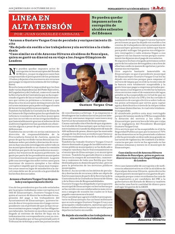 *Acusan a Gustavo Vargas Cruz de peculado y enriquecimiento ilícito *Ha dejado sin sueldo a los trabajadores y sin servicios a la ciudadanía *Caso similar es el de Azucena Olivares alcaldesa de Naucalpan, quien se gastó un dineral en su viaje a los Juegos Olímpicos de Londres