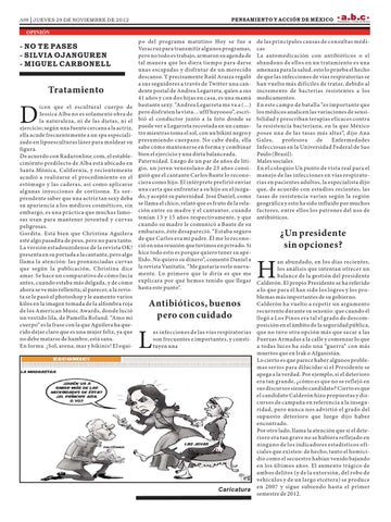 de las principales causas de consultas médicas La automedicación con antibióticos o el abandono de ellos en un tratamiento es una amenaza para la salud, esto lo prueba el hecho de que las infecciones de vías respiratorias se han vuelto más difíciles de tratar, debido al incremento de bacterias resistentes a los medicamentos. En este campo de batalla “es importante que los médicos analicen las variaciones de sensibilidad y prescriban terapias eficaces contra la resistencia bacteriana, en la que México posee una de las tasas más altas”, dijo Ana Gales, profesora de Enfermedades Infecciosas en la Universidad Federal de Sao Paulo (Brasil). Males sociales En el coloquio Un punto de vista real para el manejo de las infecciones en vías respiratorias en pacientes adultos, la especialista dijo que, de acuerdo con estudios recientes, las tasas de resistencia varían según la región geográfica y esto ha sido influido por muchos factores, entre ellos los patrones del uso de antibióticos.