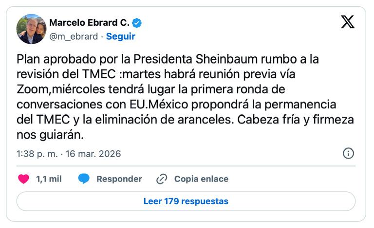 Durante las conversaciones, México propondrá la permanencia del T-MEC y la eliminación de aranceles, dos de los puntos que el Gobierno federal considera fundamentales para mantener la estabilidad comercial en la región. “México propondrá la permanencia del TMEC y la eliminación de aranceles. Cabeza fría y firmeza nos guiarán”, señaló Ebrard al dar a conocer la estrategia del país rumbo a las negociaciones. El secretario subrayó que el objetivo es preservar los beneficios del acuerdo comercial que ha permitido fortalecer el intercambio económico entre las tres economías de Norteamérica.