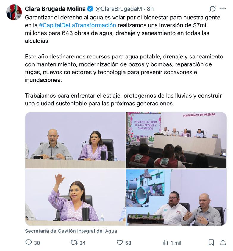 Por último, José Mario Esparza anunció que, en diciembre pasado, concluyó la primera etapa del programa de Acupuntura Hídrica, con la habilitación de cien puntos de infiltración en beneficio de 80 mil habitantes. Para este año, la meta es habilitar otros cien puntos, para absorber hasta mil litros de agua de lluvia, por segundo. A pesar de insistir en que las medidas garantizan una mejor gestión del agua, Clara Brugada reconoció que el estrés hídrico que padece la ciudad “no es un tema que se resuelva en un año”. “Tenemos que tener un proceso de años, de varios años, hasta que logremos equilibrio hídrico en la ciudad; ése es nuestro objetivo, garantizar que el agua que obtengamos del subsuelo, tengamos la capacidad de garantizar agua que se infiltra al subsuelo”
