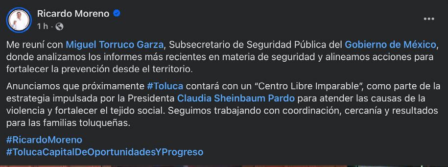 Moreno destacó que el trabajo coordinado entre los distintos niveles de gobierno permitirá generar resultados concretos en favor de las familias toluqueñas, mediante políticas de cercanía, prevención y atención integral a los factores que inciden en la seguridad pública.