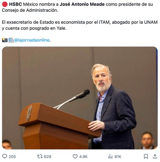 HSBC México nombró a José Antonio Meade como nuevo presidente de su Consejo de Administracióna partir del 3 de febrero 2026”
