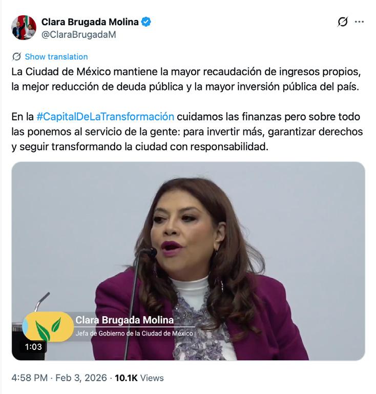 La jefa de Gobierno, Clara Brugada, informó que en 2025, el primer año completo de su gestión, la Ciudad de México registró ingresos totales por 334 mil 327 millones de pesos y anunció una inversión pública proyectada de 57 mil 911 millones de pesos para 2026. Durante la presentación del balance financiero correspondiente a 2025, la morenista dijo que la inversión pública estimada para 2026 representa un incremento de 55% respecto a la ejercida en 2024, y precisó que los recursos se destinarán principalmente a obras de infraestructura en materia de agua y movilidad. El anuncio de la proyección para 2026, que implica una diferencia de 45.5 puntos porcentuales frente al crecimiento de la inversión pública observado en 2025 –de 9.5%–, se dio a 128 días del Mundial de Futbol de la FIFA, en el que la Ciudad de México será sede de seis partidos, incluido el encuentro inaugural. Desde el Palacio Virreinal, la mandataria informó que los ingresos totales de la capital presentaron un crecimiento anual de 8.5% respecto a 2024 y el cumplimiento total de la Ley de Ingresos. De acuerdo con los datos, los ingresos locales aumentaron 21.7% durante 2025.