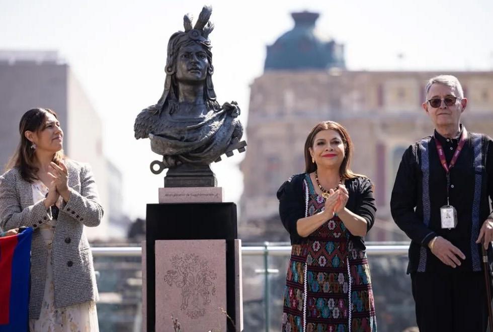 La jefa de Gobierno, Clara Brugada, develó el busto de Cuauhtémoc, en el marco de la ceremonia de honores fúnebres por el 501 aniversario luctuoso del último tlatoani mexica. En su mensaje señaló que recordar este hecho es un acto de memoria histórica y de reafirmación de identidad para la ciudad y el país, y devela su busto en calles del Centro Histórico. Durante el acto solemne, realizado a un costado del Templo Mayor, destacó que la escultura develada guarda un mensaje profundo: “aunque pasen los siglos, aquí seguirá