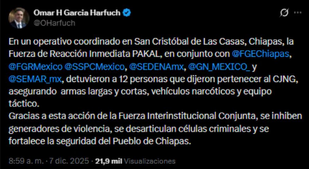 La Secretaría de Seguridad y Protección Ciudadana (SSPC), encabezada por Omar García Harfuch, logró un doble golpe al crimen organizado este domingo 7 de diciembre con dos operativos que resultaron en la detención de 12 presuntos integrantes del Cártel Jalisco Nueva Generación (CJNG) en Chiapas, y en el aseguramiento de 320 kilos de metanfetamina en Sinaloa. En el primer operativo, hecho en el municipio de Tapachula, Chiapas, la Fuerza de Reacción Inmediata PAKAL, en conjunto con la Fiscalía General de Chiapas (FGE), la Fiscalía General de la República (FGR), Secretaría de Marina (Semar) y de la Defensa Nacional (Defensa), Guardia Nacional (GN) y SSPC, lograron la captura de 12 personas, presuntamente pertenecientes al CJNG. Durante el arresto, las autoridades también incautaron diversas cantidades de narcóticos y equipo táctico, incluyendo armas de fuego y vehículos. La detención es considerada un golpe significativo al crimen organizado en la región, ya que el CJNG ha intensificado sus actividades ilícitas en el sur del país. En Los Mochis, Sinaloa, el segundo operativo fue ejecutado por autoridades federales, lo que resultó en la captura de dos personas acusadas de delitos contra la salud. Durante la intervención, se aseguró una carga de 320 kilos de metanfetamina. El aseguramiento considerado un logro en la lucha contra el narcotráfico.