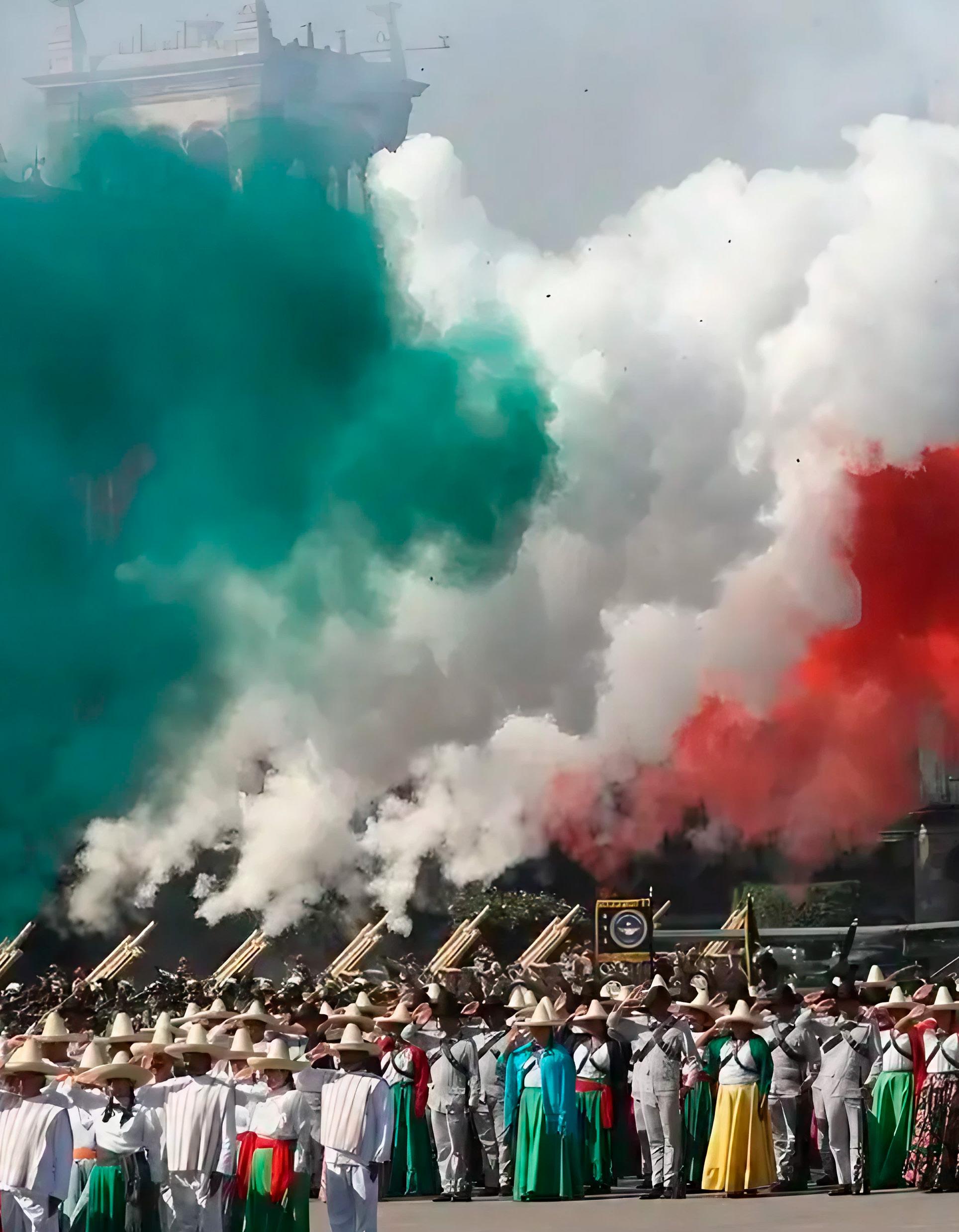Desfilaron ante el pueblo de México, una bandera monumental, cuatro estandartes de guerra, 2 mil 759 integrantes del Ejército y Fuerza Aérea Mexicanos, 19 deportistas, 100 charros, 44 civiles, 62 niños, 34 vehículos terrestres, nueve vehículos antiguos, 503 caballos, 23 aeronaves, tres águilas